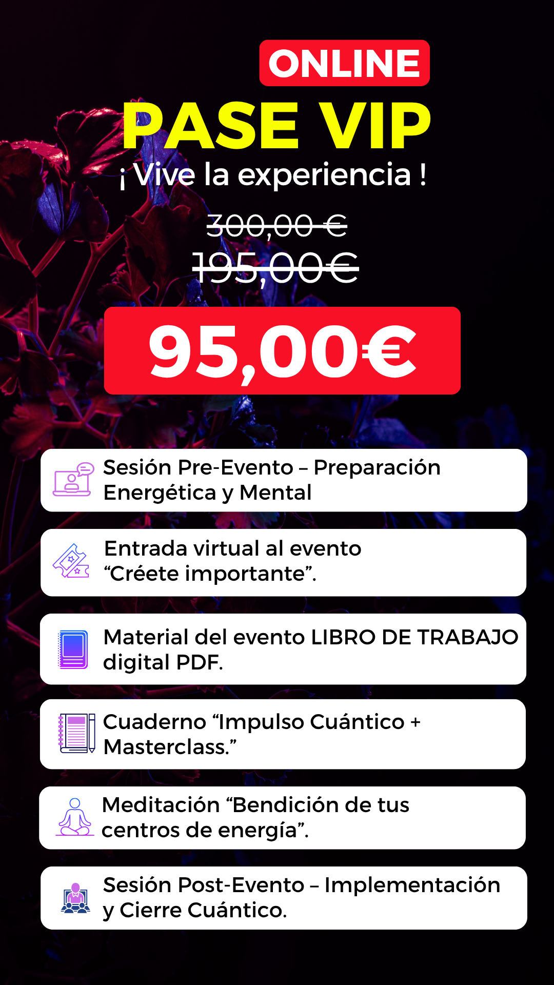 ✓ Durante el evento no estarás como simple espectador. Participarás activamente en ejercicios de reflexión, dinámicas de conciencia y momentos de conexión profunda contigo misma. Todo está diseñado para que sientas la energía del grupo y la guía de Sonia como si estuvieras allí en persona.